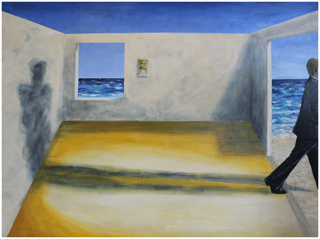 Una figura en contraluz abandona una sala a toda prisa. Solo queda atrás su sombra sobre la pared del fondo y una pintura de una silla sencilla. El paisaje de cielo y mar se deja ver a través de la puerta, la ventana del fondo y la ausencia de un techo.